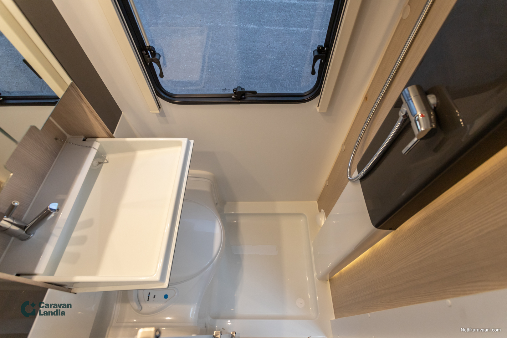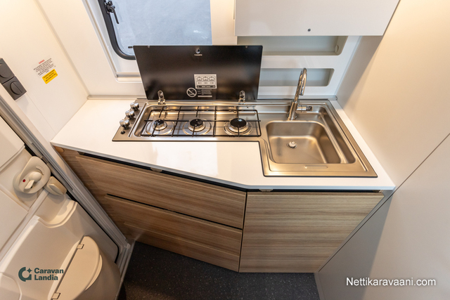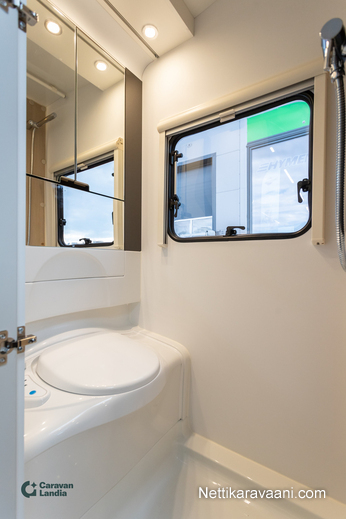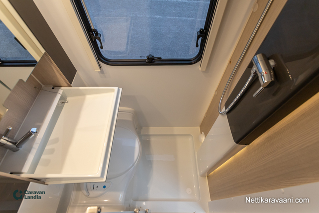 Sisätilat ja mukavuudet: Kasetti WC, Suihku, Lämminvesiboileri, Liesi, Jääkaappi, Pakastelokero, Takakeittiö, Pesuallas