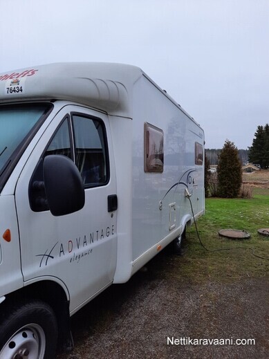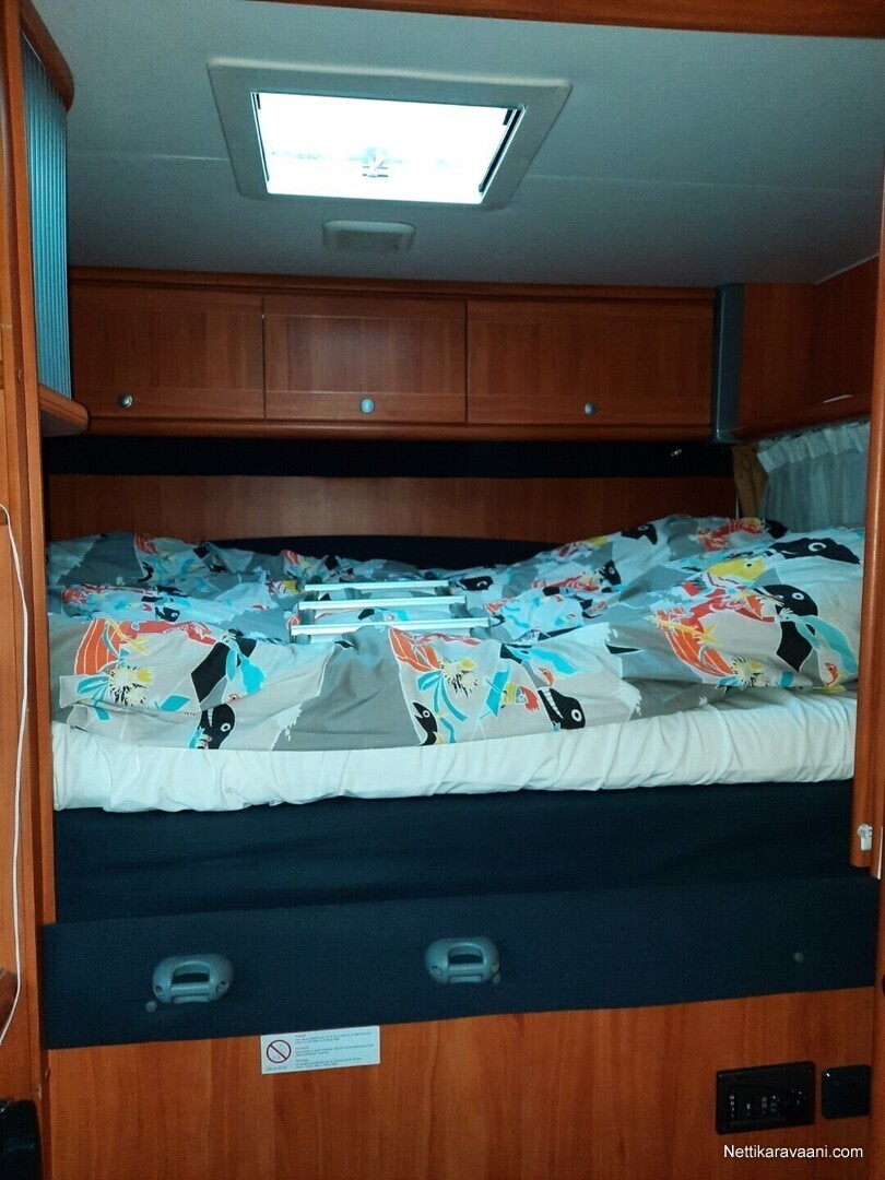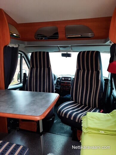 Sisätilat ja mukavuudet: Ohjaustehostin, Kasetti WC, Lämminvesiboileri, Markiisi, TV-antenni tai lautasantenni, Liesi, Jääkaappi, Pakastelokero, Parivuode, Kasettiverhot, Lattiamatot asunto-osassa, Pesuallas, Stereot