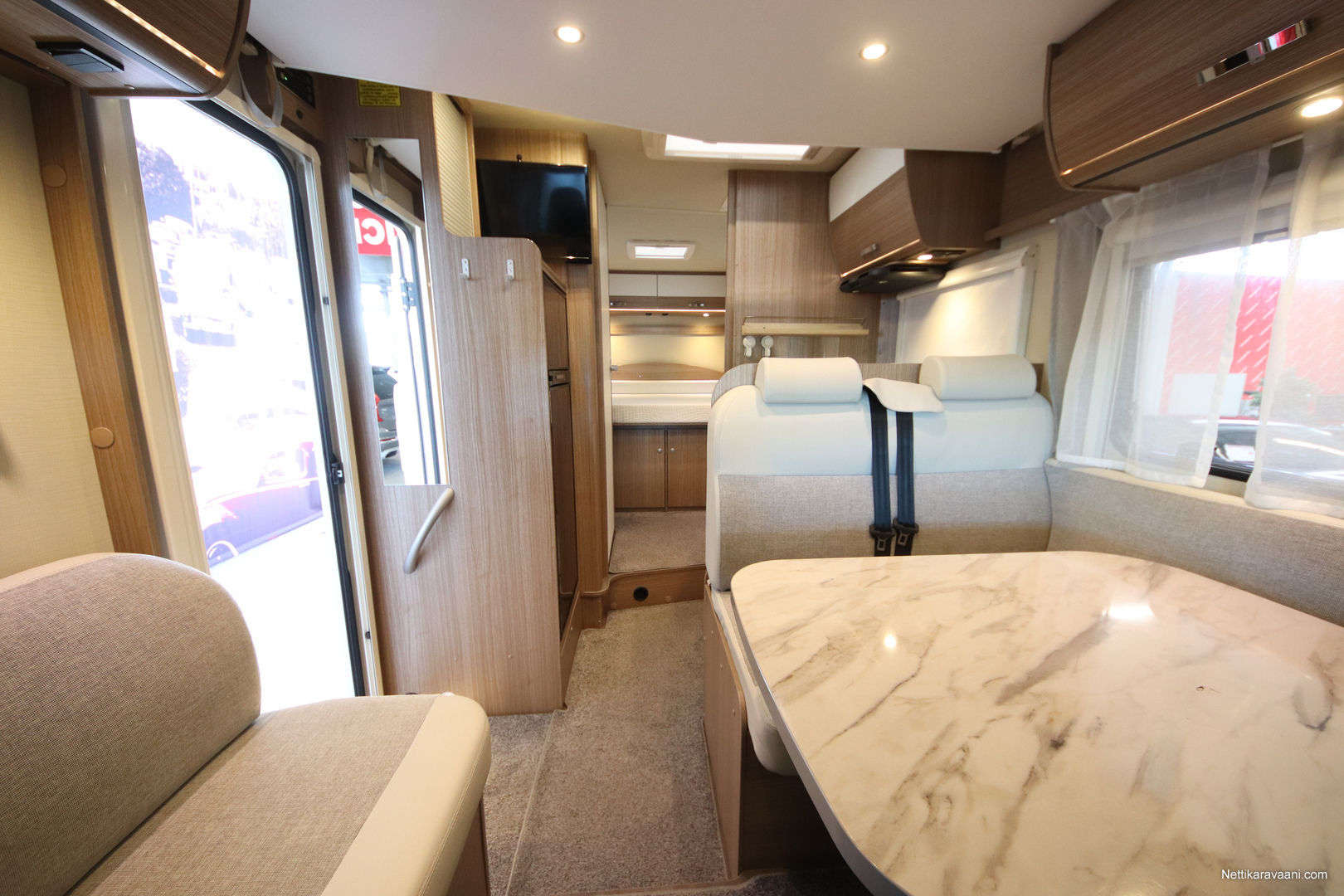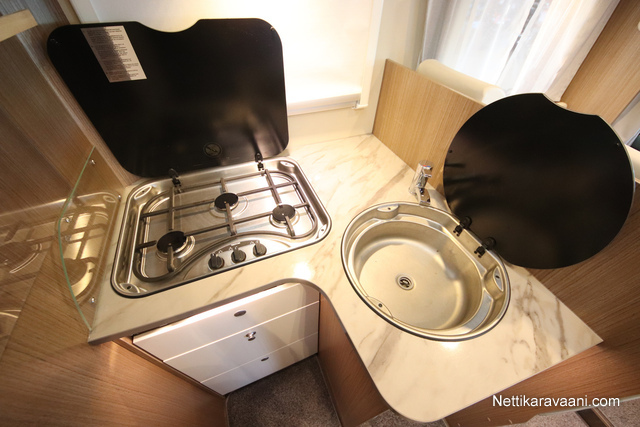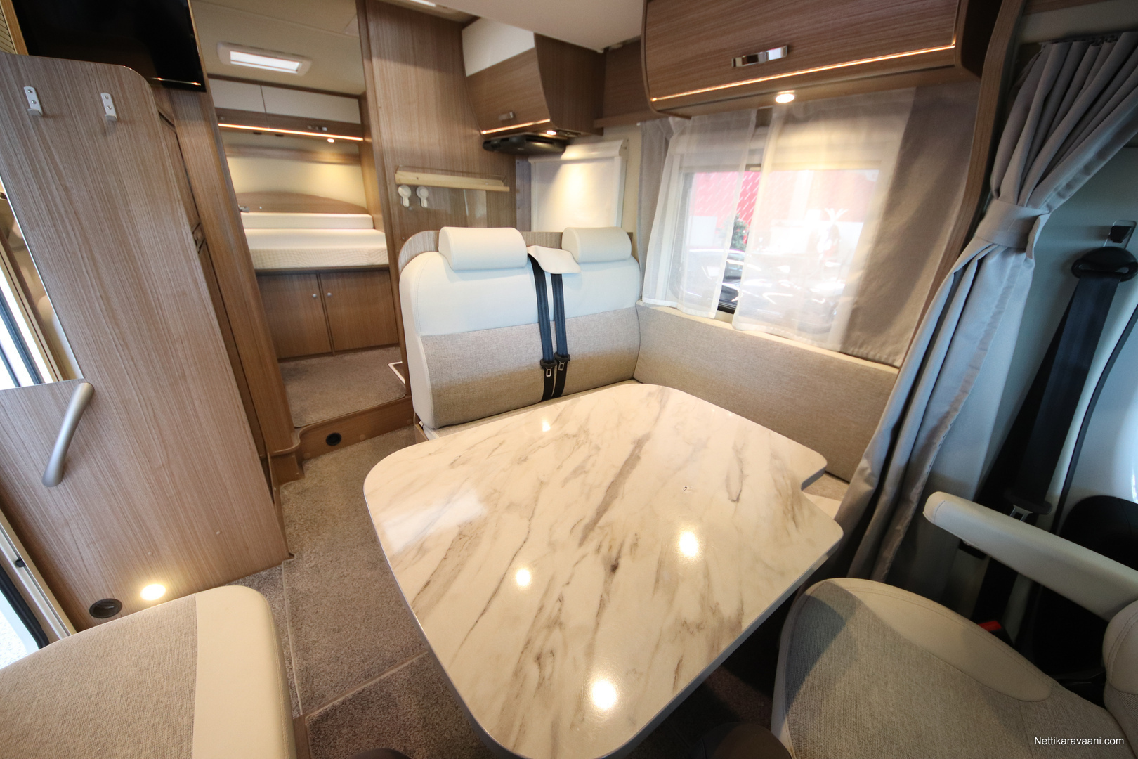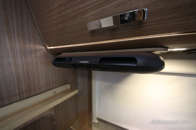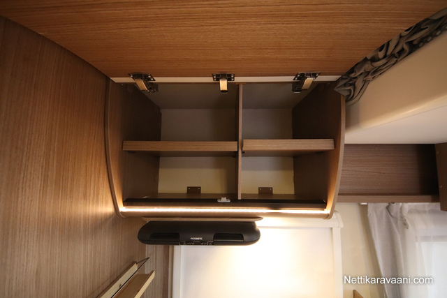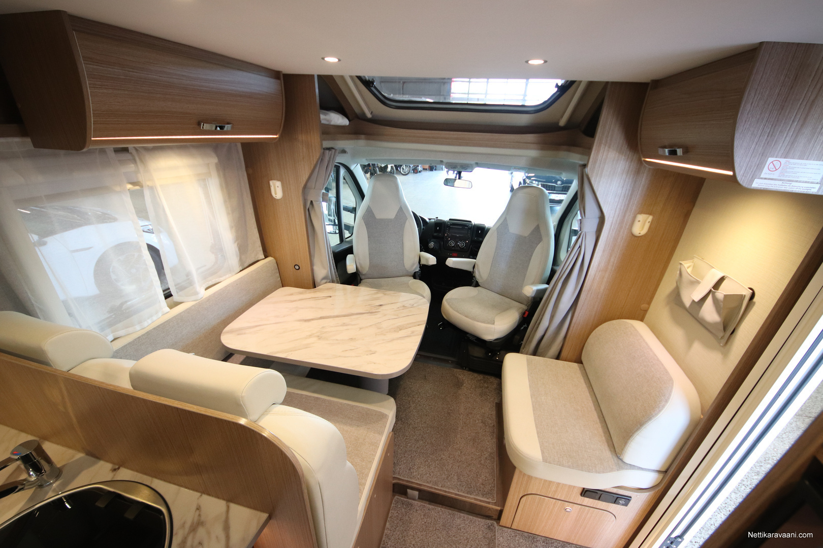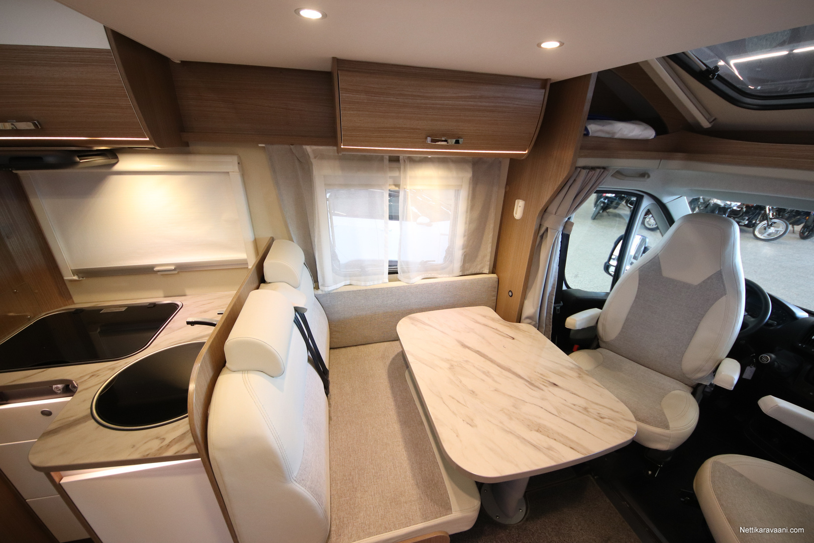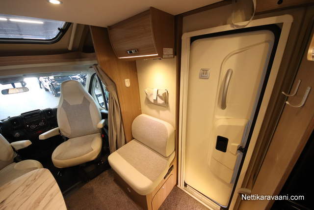 BASIC- PAKETTI: sis.( Panoraama kattoikkuna istuinryhmän yläpuolella, Kirkaslasinen kattoluukku (MiniHeki) 40x 40, Muoviset suihkuseinät, Peili vaatenaulakolla, Puinen suihkuritilä, Captain Chair istuimet asunto- osan verhoilulla, LED- valaisin asunto- osassa, Lisäpistorasia keittiön yläkaapistossa, Vaatetanko suihkutilassa, Pistorasia tallissa.)
