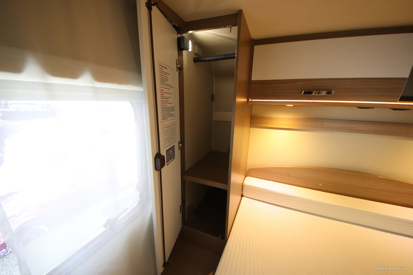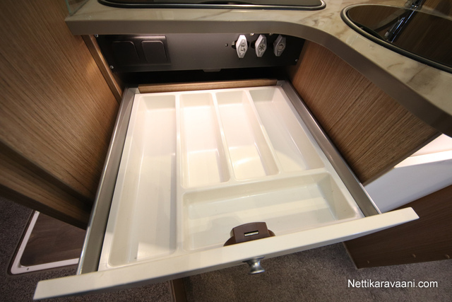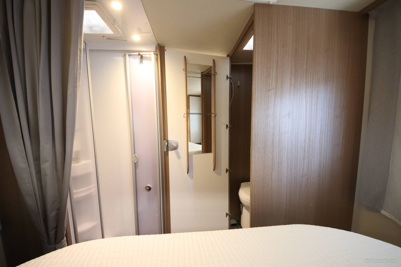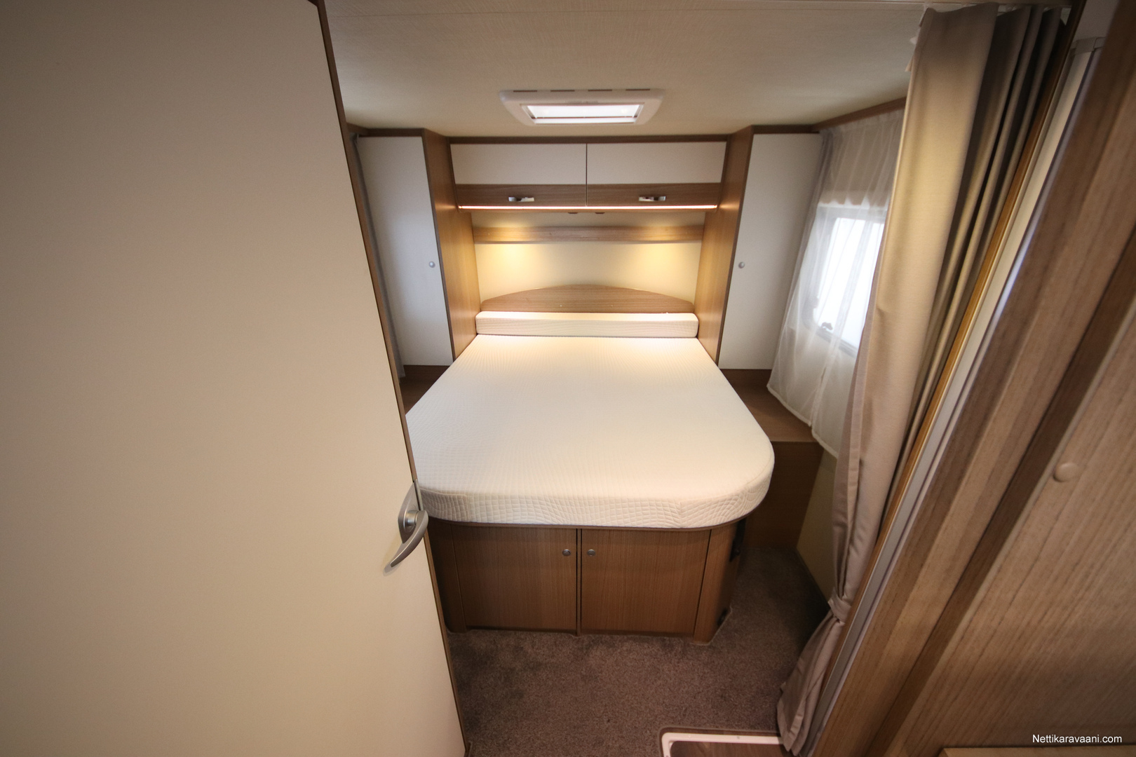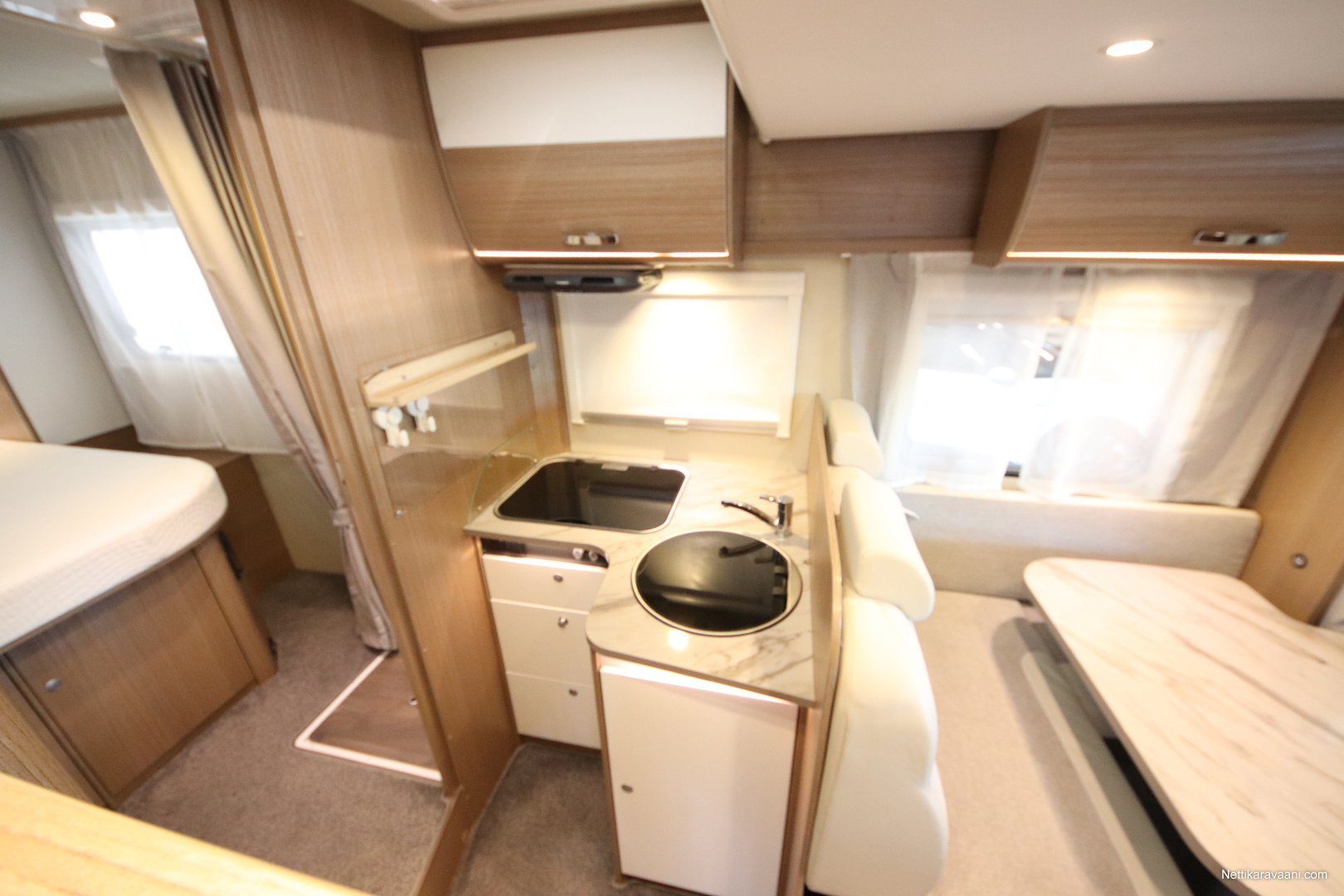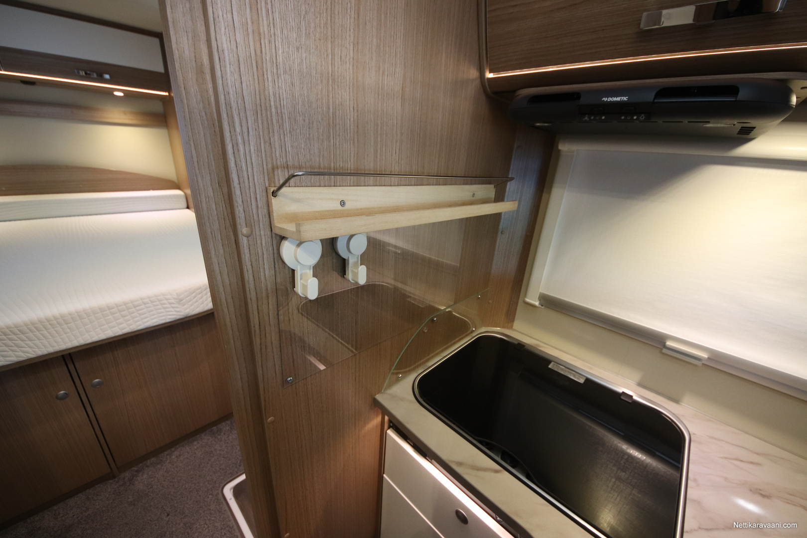BASIC- PAKETTI: sis.( Panoraama kattoikkuna istuinryhmän yläpuolella, Kirkaslasinen kattoluukku (MiniHeki) 40x 40, Muoviset suihkuseinät, Peili vaatenaulakolla, Puinen suihkuritilä, Captain Chair istuimet asunto- osan verhoilulla, LED- valaisin asunto- osassa, Lisäpistorasia keittiön yläkaapistossa, Vaatetanko suihkutilassa, Pistorasia tallissa.)