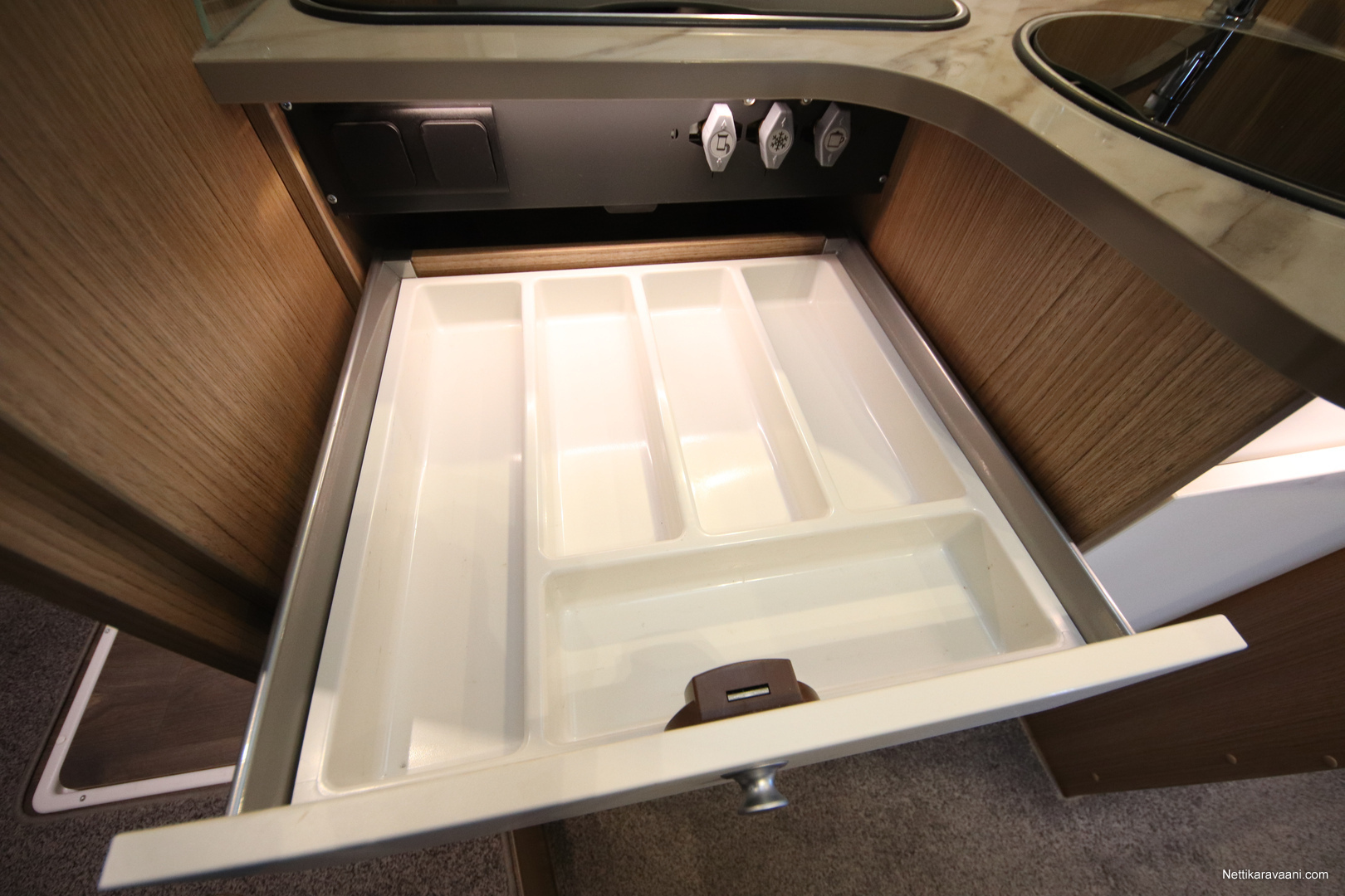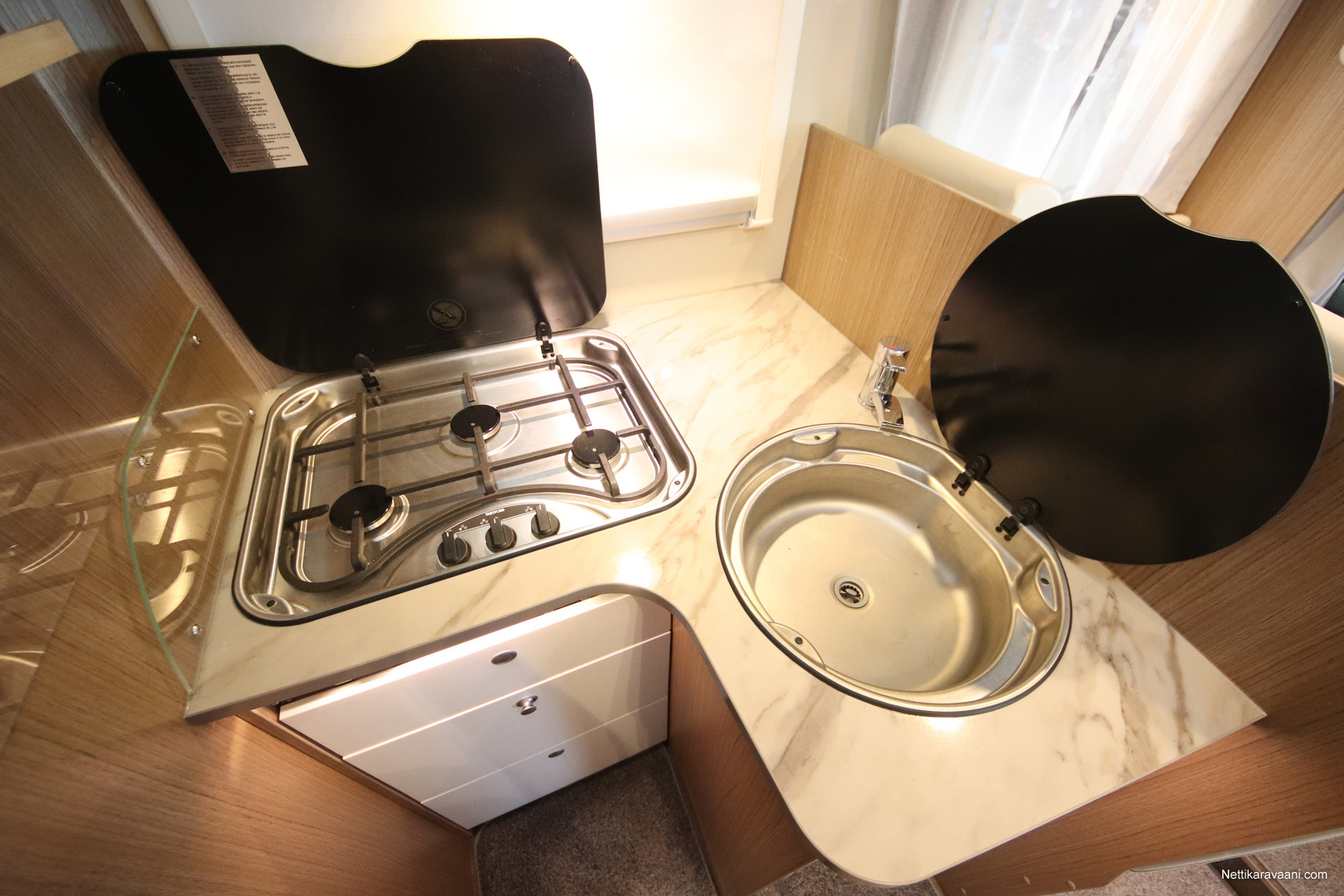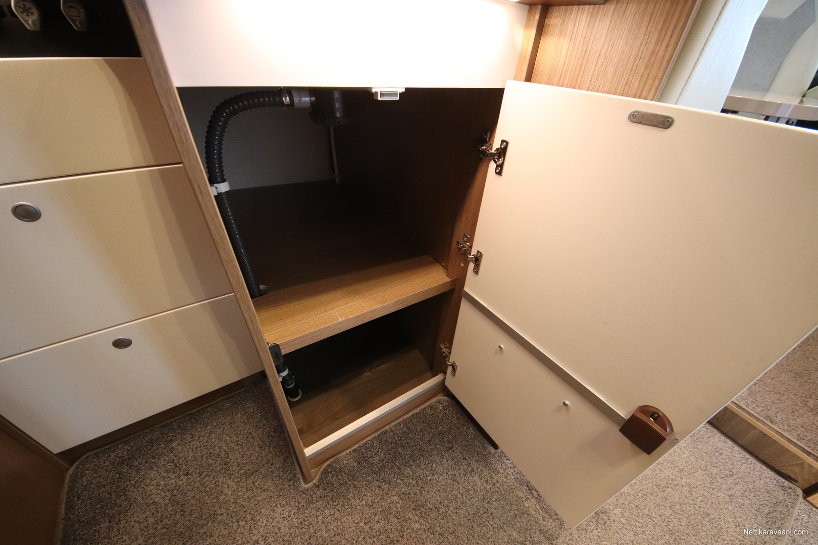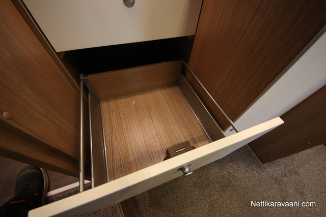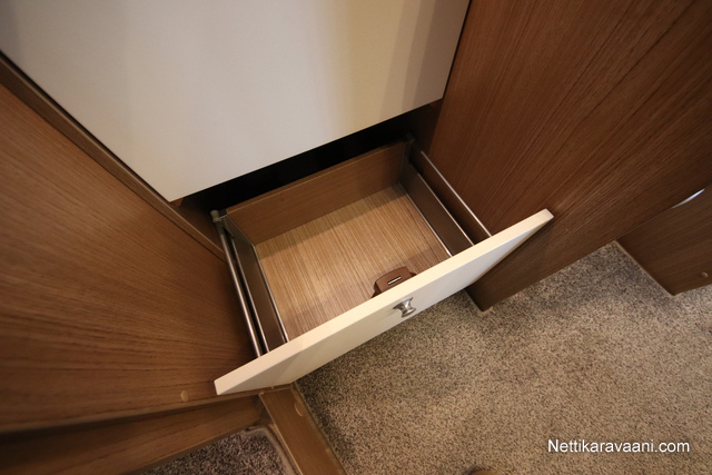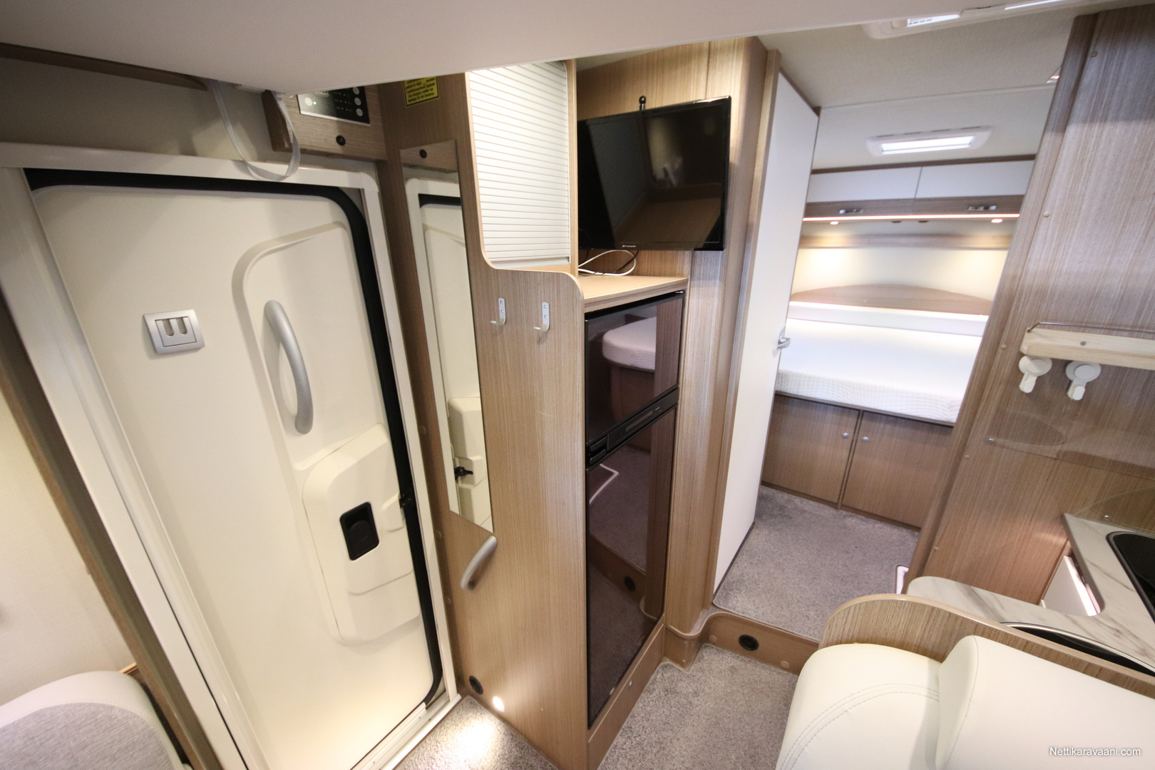 BASIC- PAKETTI: sis.( Panoraama kattoikkuna istuinryhmän yläpuolella, Kirkaslasinen kattoluukku (MiniHeki) 40x 40, Muoviset suihkuseinät, Peili vaatenaulakolla, Puinen suihkuritilä, Captain Chair istuimet asunto- osan verhoilulla, LED- valaisin asunto- osassa, Lisäpistorasia keittiön yläkaapistossa, Vaatetanko suihkutilassa, Pistorasia tallissa.)