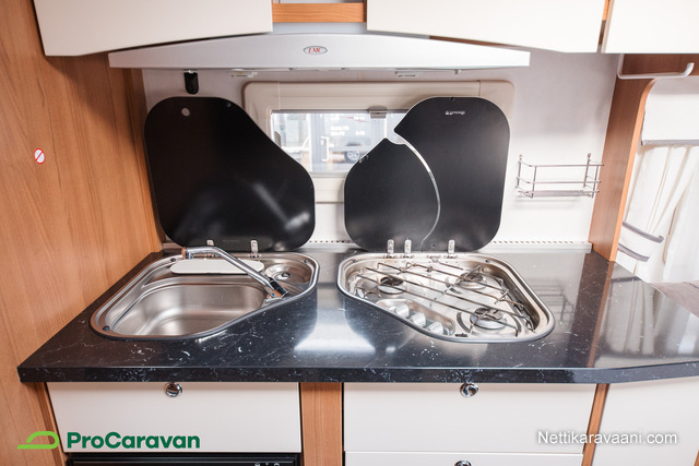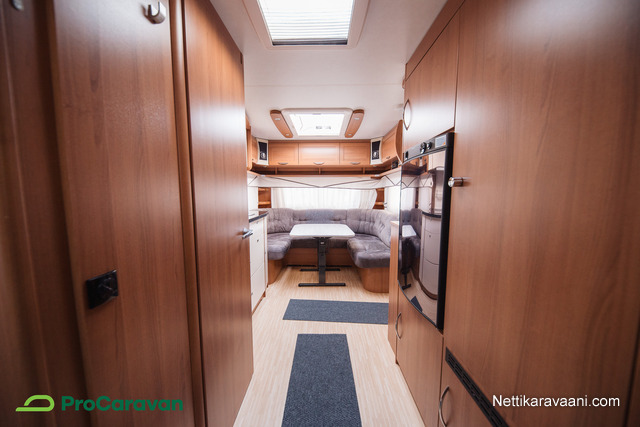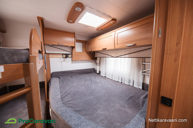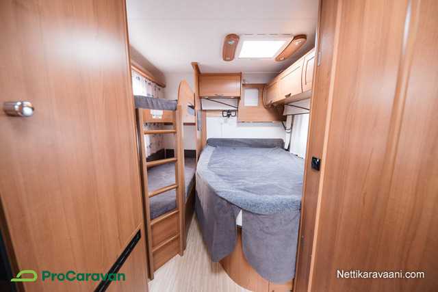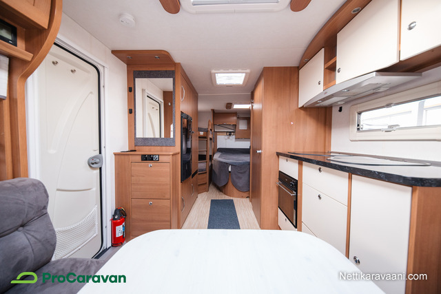 Vaunun sisätiloissa on tilava pöytäryhmä, joka muuntuu tarvittaessa lisävuoteeksi. Parivuode sekä erilliset kerrossänky ja kaapista taittuva ylävuode tarjoavat nukkumatilaa pienemmille perheenjäsenille. Keittiössä on jääkaappi, kaasu-uuni, liesi ja pakastelokero, joten ruoanlaitto onnistuu helposti matkan päällä. Kasetti-WC, pesuallas ja Alde-nestekiertolämmitys tuovat arjen mukavuudet matkalle.