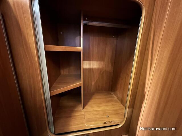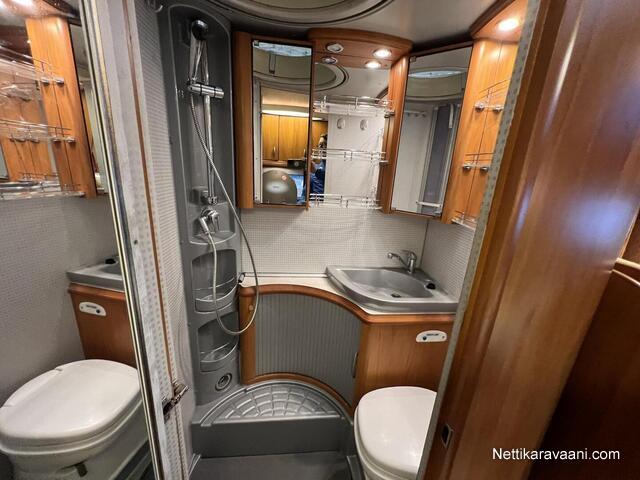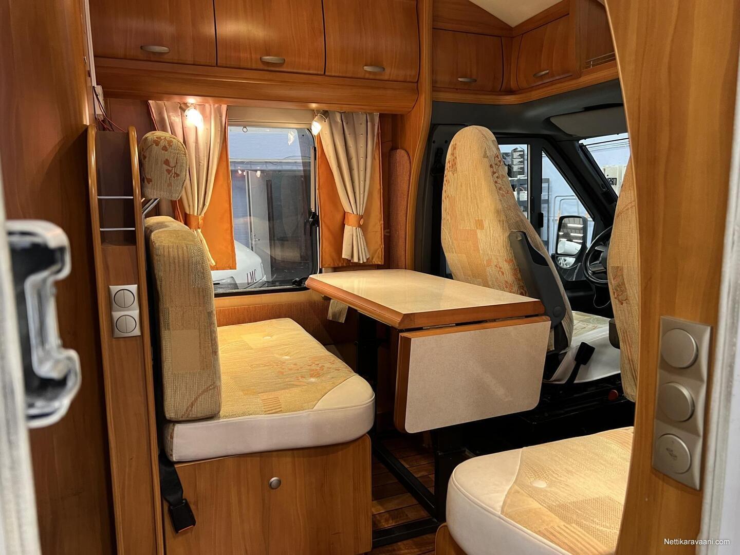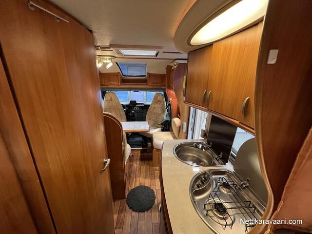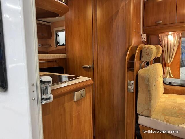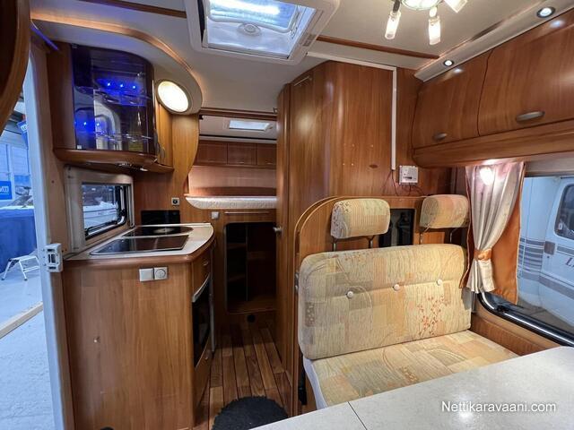 Sisätilat ja mukavuudet: Ohjaustehostin, Sähkökäyttöiset ikkunat, Sisätilanpistoke, Vakionopeudensäädin, Ajotietokone, Kasetti WC, Suihku, Lämminvesiboileri, Markiisi, Ilmastointi ajotilassa, Liesi, Jääkaappi, Pakastelokero, Kaasu-uuni, Kasettiverhot, Pesuallas, Pysäköintikamera, Keskuslukitus: Kaukosäätöinen, Ilmastointi: Manuaalinen, Stereot: CD-soitin+Radio