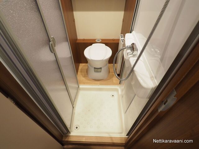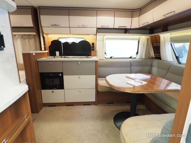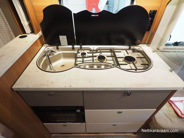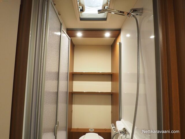 Sisätilat ja mukavuudet: Kasetti WC, Markiisi, TV-antenni tai lautasantenni, Jääkaappi, Kaasu-uuni, Kasettiverhot, Lattiamatot asunto-osassa