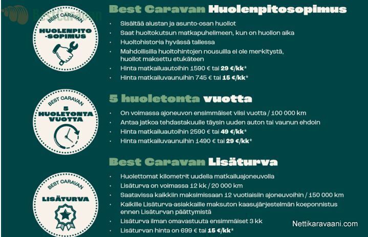 Nettikaravaani.com ei ota vastuuta myyjän antamien tietojen paikkansapitävyydestä. Ilmoitetuissa tiedoissa saattaa olla myös tahattomia puutteita tai virheitä. Tieto on siis sitova vasta kun myyjä on sen pyynnöstäsi vahvistanut.